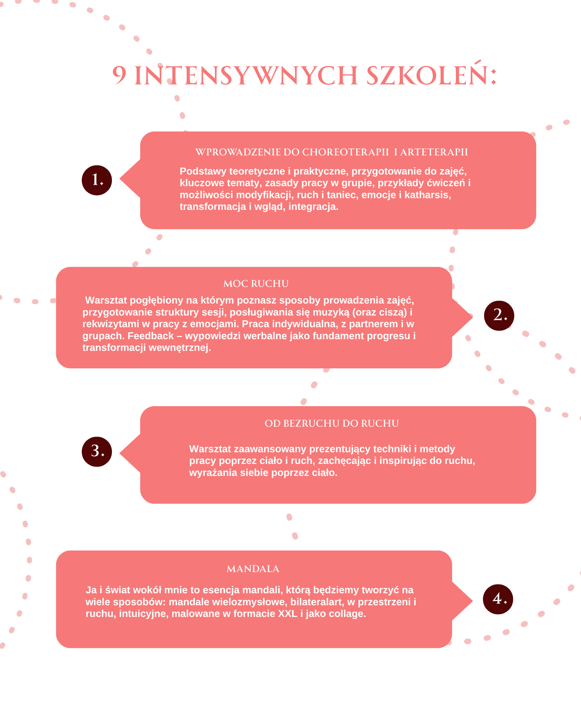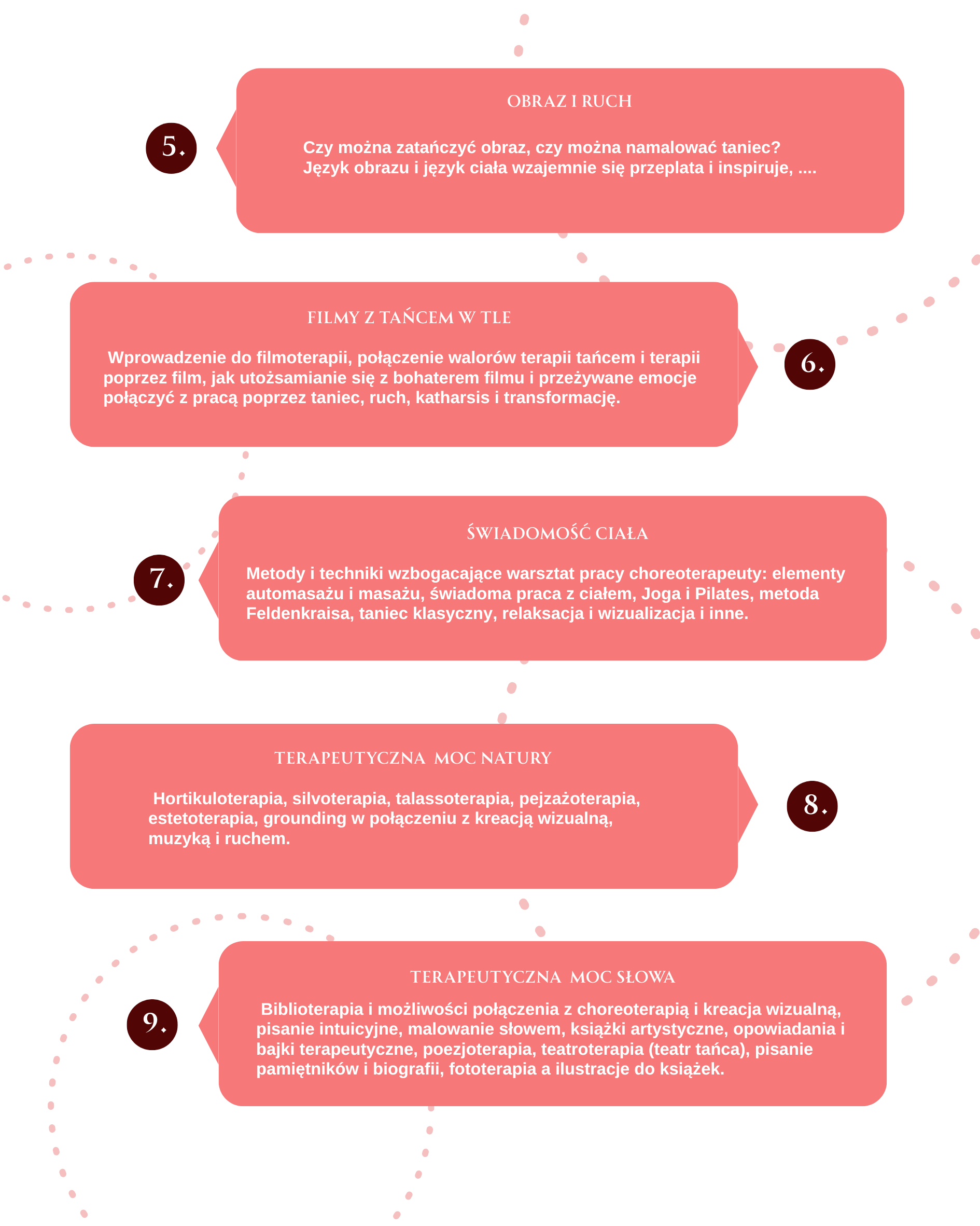 Zawartość pakietu – 9 szkoleń na poziomie zaawansowanym prezentujących walory terapeutyczne terapii tańcem i arteterapii: